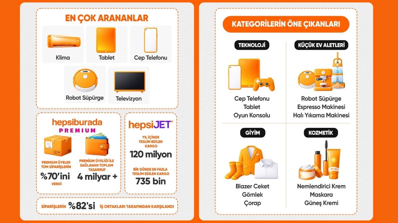 Kullanıcıların platformdaki arama davranışları incelendiğinde, marka bazında en sık aratılanlar arasında; Stanley, Apple, Dyson, Fissler, Lego ve adidas öne çıktı. Klima, tablet, cep telefonu, robot süpürge, televizyon ve erkek spor ayakkabı yıl boyunca en çok arananlar arasında yer aldı. Hepsiburada’da verilen siparişlerin %82’si iş ortakları tarafından karşılandı.