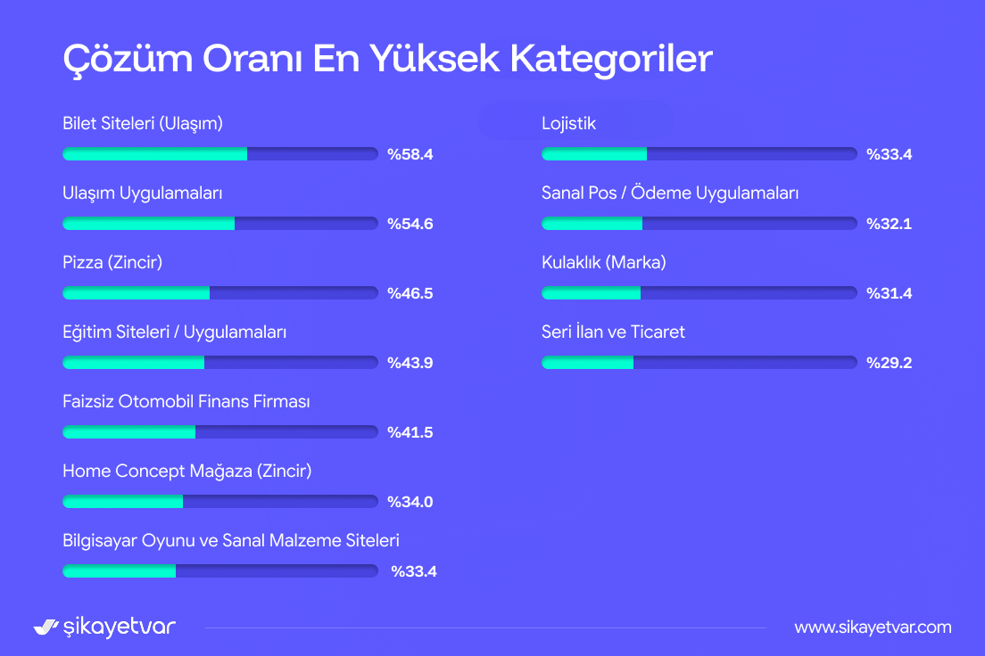 Temizlik sektörü bir önceki yıla kıyaslandığında yüzde 29,7 artışla çözüm oranı en yüksek sektörlerde bu yıl ilk sırada yer aldı. Emlak ve inşaat sektöründe bir önceki yılda 5 bin 391 olan çözüm sayısı yüzde 26’lık çözüm oranıyla 20 bin 494’e yükseldi. Kargo ve nakliyat, internet platformları, gıda ve sigortacılık çözüm oranıyla yılı zirvede kapatan sektörler oldu.