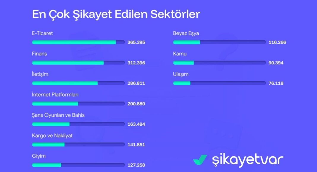 Şikayetvar tarafından açıklanan verilere göre e-ticaret sektörü 365 bin 395 şikayet sayısıyla tüketicilerin en çok çözüm beklediği sektör oldu. 2. sırada 312 bin 396 şikayet sayısıyla finans sektörü olurken, iletişim sektörü 286 bin 811 sayısıyla 3. sırada yer aldı. İnternet platformları (200 bin 880), şans oyunları ve bahis (163 bin 484), kargo ve nakliyat (141 bin 851), giyim (127 bin 258), beyaz eşya (116 bin 266), kamu (90 bin 394) ve ulaşım sektörü en çok şikayet edilen sektörler olarak sıralamada yerini aldı.