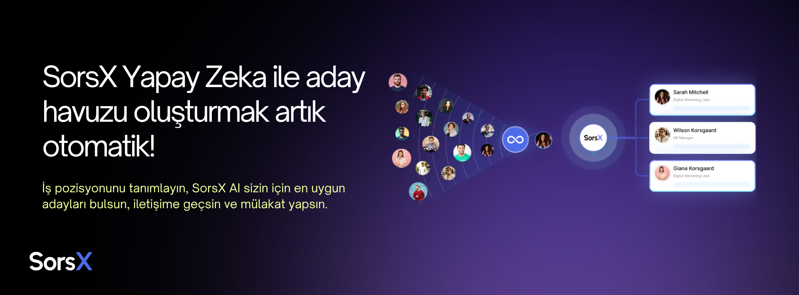 Amacımız; Türkiye’de küçük ölçekli işletmelerden büyük kurumsal yapılara kadar tüm organizasyonların işe alım süreçlerinde yapay zekayı benimsemesini sağlamak ve bu dönüşümü kolaylaştırmaktır. SorsX olarak, uçtan uca yapay zeka destekli bir işe alım platformu geliştiriyoruz. Bu platform, yetenek kazanımı ve insan kaynakları süreçlerinin tamamını otomatikleştirerek şirketlere modern, hızlı ve verimli bir işe alım deneyimi sunar.